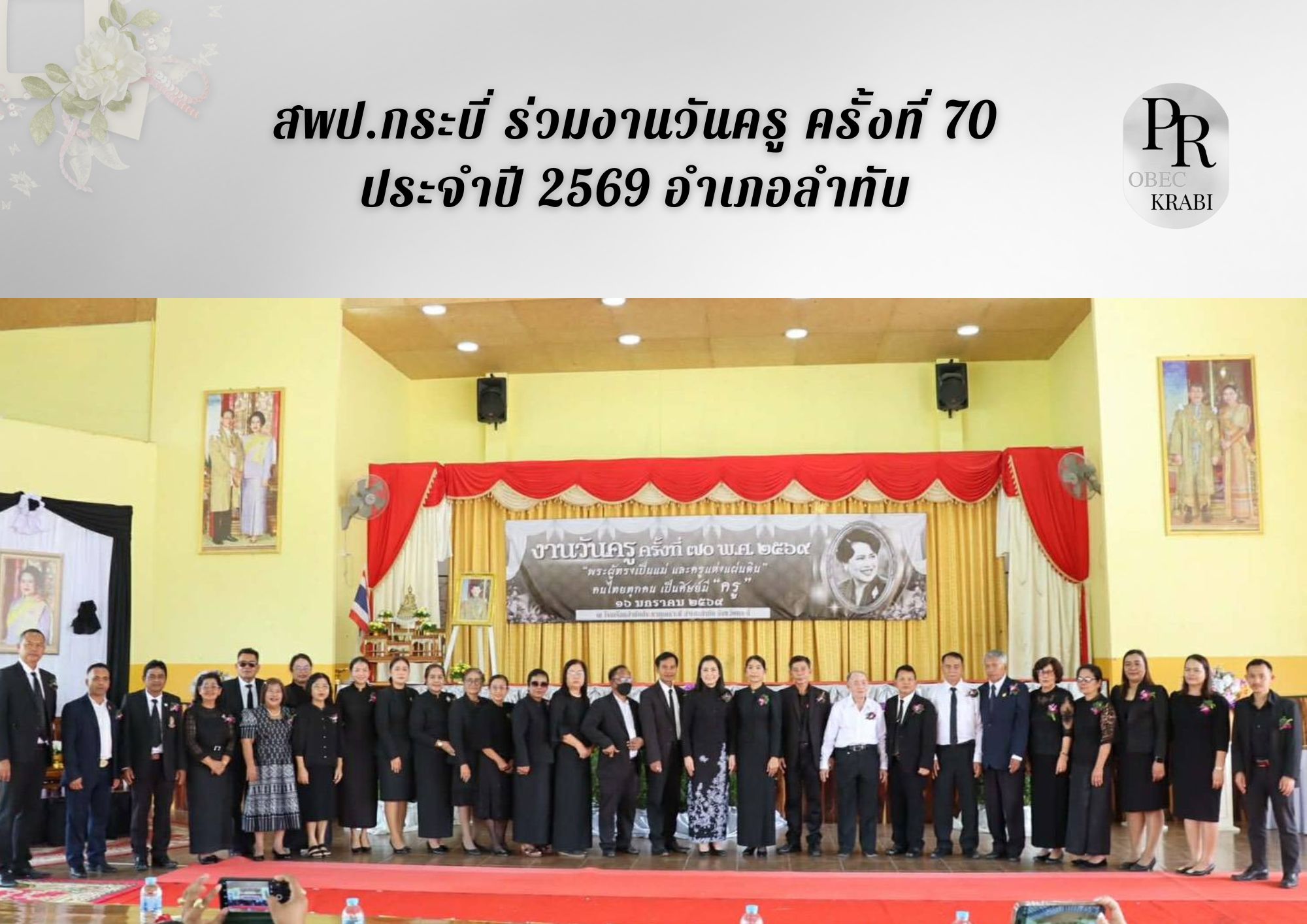 วันที่ 16 มกราคม 2569 ที่ห้องประชุมโรงแรมมาริไทม์ปาร์ค แอนด์ สปา รีสอร์ท อำเภอเมืองกระบี่ สำนักงานศึกษาธิการจังหวัดกระบี่ โดยคุรุสภาจังหวัดกระบี่ จัดงานวันครูจังหวัดกระบบี่ ครั้งที่ 70 ประจำปี 2569 เพื่อระลึกถึงพระคุณบูรพาจารย์ และยกย่องเชิดชูเกียรติผู้ประกอบวิชาชีพทางการศึกษา โดยช่วงเช้าเวลา 07.30 น. พิธีทำบุญตักบาตร และเวลา 09.00 น. พิธีรำลึกถึงพระคุณบูรพาจารย์ โดยนายอังกูร ศีลาเทวากูล ผู้ว่าราชการจังหวัดกระบี่ เป็นประธานในพิธีเปิด พร้อมอ่านสารวันครูของนายกรัฐมนตรี นายนันท์ สังข์ชุม ศึกษาธิการจังหวัดกระบี่ กล่าวรายงานและอ่านสารวันครูของรัฐมนตรีว่าการกระทรวงศึกษาธิการ