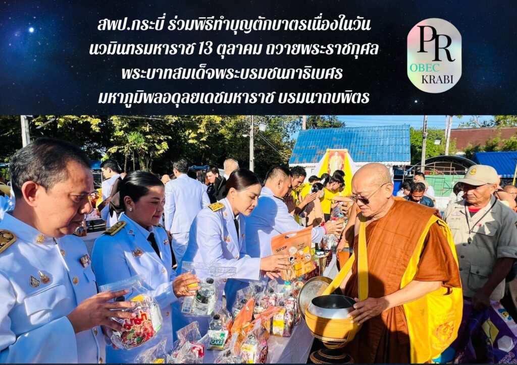 วันที่ 13 ตุลาคม 2568 เวลา 07.00 น. ที่บริเวณอุโบสถ วัดแก้วโกรวาราม พระอารามหลวง อำเภอเมืองกระบี่ ดร.สิณีณาฏ อารีย์ รองผู้อำนวยการสำนักงานเขตพื้นที่การศึกษาประถมศึกษากระบี่ พร้อมบุคลากรในสำนักงาน ได้รับมอบหมายจากผู้อำนวยการสำนักงานเขตพื้นที่การศึกษาประถมศึกษากระบี่ ร่วมพิธีสวดพระพุทธมนต์และทำบุญตักบาตรถวายพระราชกุศล เนื่องในวันนวมินทรมหาราช 13 ตุลาคม ซึ่งเป็นวันคล้ายวันสวรรคต พระบาทสมเด็จพระบรมชนกาธิเบศร มหาภูมิพลอดุลยเดชมหาราช บรมนาถบพิตร โดยมีนายรัฐศาสตร์ ชิดชู ผู้ว่าราชการจังหวัดกระบี่ เป็นประธานในพิธี มีพระราชสุทธิวิมล ดร. เจ้าคณะจังหวัดกระบี่ เป็นประธานสงฆ์ มีหัวหน้าส่วนราชการ ข้าราชการพลเรือน ตุลาการ ทหาร ตำรวจ เหล่ากาชาด แม่บ้านมหาดไทย องค์กรอิสระ องค์กรปกครองส่วนท้องถิ่น และประชาชนร่วมในพิธีอย่างพร้อมเพรียง เพื่อถวายพระราชกุศลพระบาทสมเด็จพระบรมชนกาธิเบศร มหาภูมิพลอดุลยเดชมหาราช บรมนาถบพิตร