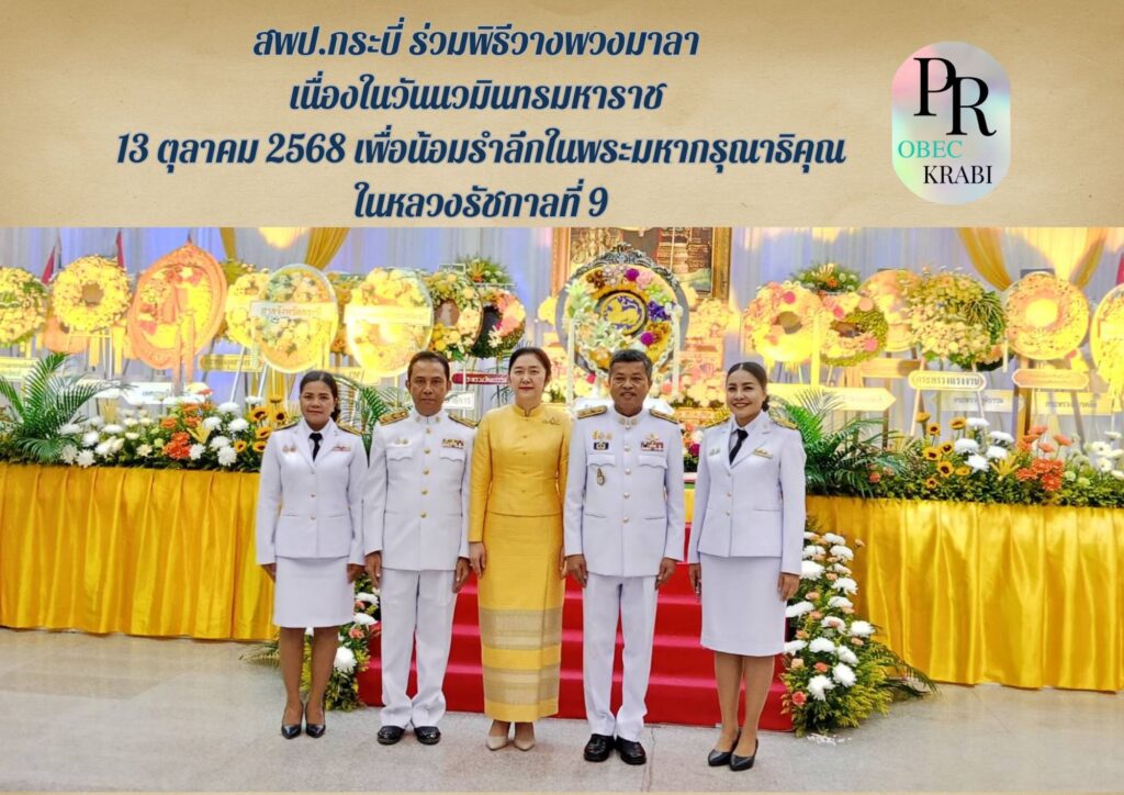 วันที่ 13 ตุลาคม 2568 เวลา 09.00 น. ณ ห้องประชุมช้างเผือก องค์การบริหารส่วนจังหวัดกระบี่ ตำบลไสไทย อำเภอเมืองกระบี่ จังหวัดกระบี่ ดร.สิณีณาฏ อารีย์ รองผู้อำนวยการสำนักงานเขตพื้นที่การศึกษาประถมศึกษากระบี่ พร้อมด้วยบุคลากรในสังกัด ได้รับมอบหมายจาก ดร.จอมขวัญ นครไธสง ผู้อำนวยการสำนักงานเขตพื้นที่การศึกษาประถมศึกษากระบี่ เข้าร่วมพิธีวางพวงมาลา เนื่องในวันนวมินทรมหาราช 13 ตุลาคม 2568 ซึ่งเป็นวันคล้ายวันสวรรคตของพระบาทสมเด็จพระบรมชนกาธิเบศร มหาภูมิพลอดุลยเดชมหาราช บรมนาถบพิตร โดยพิธีดังกล่าวจัดขึ้นเพื่อแสดงออกถึงความจงรักภักดีและน้อมรำลึกในพระมหากรุณาธิคุณอันหาที่สุดมิได้ โดยมีนายรัฐศาสตร์ ชิดชู ผู้ว่าราชการจังหวัดกระบี่ เป็นประธานในพิธีวางพวงมาลาเบื้องหน้าพระบรมฉายาลักษณ์ พร้อมด้วยหัวหน้าส่วนราชการ ข้าราชการพลเรือน ผู้พิพากษาหัวหน้าศาล อัยการ ทหาร ตำรวจ องค์กรอิสระ สมาชิกวุฒิสภา พนักงานรัฐวิสาหกิจ เหล่ากาชาดจังหวัด แม่บ้านมหาดไทยจังหวัด องค์กรปกครองส่วนท้องถิ่น ภาคเอกชน และประชาชนชาวจังหวัดกระบี่ เข้าร่วมในพิธีอย่างพร้อมเพรียง บรรยากาศเป็นไปด้วยความสงบและเปี่ยมด้วยความสำนึกในพระมหากรุณาธิคุณ