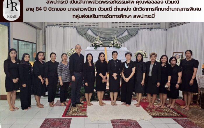 ันพฤหัสบดีที่ 18 ธันวาคม 2568 เวลา 19.30 น. ที่ศาลา 1 วัดแก้วโกรวาราม พระอารามหลวง อ.เมืองกระบี่ จ.กระบี่ ดร.จอมขวัญ นครไธสง ผู้อำนวยการสำนักงานเขตพื้นที่การศึกษาประถมศึกษากระบี่ เป็นประธานในพิธีสวดพระอภิธรรมศพ คุณพ่อฉลอง บัวมณี ซึ่งเป็นบิดาของ นางสาวพนิดา บัวมณี ตำแหน่ง นักวิชาการศึกษาชำนาญการพิเศษ กลุ่มส่งเสริมการจัดการศึกษา สพป.กระบี่ ได้ถึงแก่กรรมเมื่อวันที่ 16 ธันวาคม 2568 และร่วมเป็นเจ้าภาพสวดพระอภิธรรมศพ พร้อมด้วยรองผู้อำนวยการสำนักงานเขตพื้นที่การศึกษาประถมศึกษากระบี่ ผู้อำนวยการกลุ่มและบุคลากร โดยกำหนดฌาปนกิจศพ ในวันจันทร์ที่ [...]